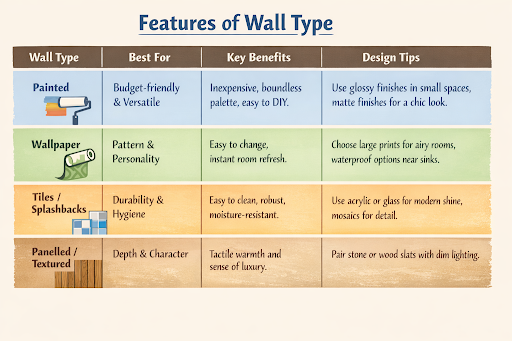 Texture gives the room a greater sense of size and adds a layer of comfort. Vertical wooden slats have a modern yet natural feel. PVC panels offer low maintenance. Stone or brick-effect surfaces are perfect for rustic styles.